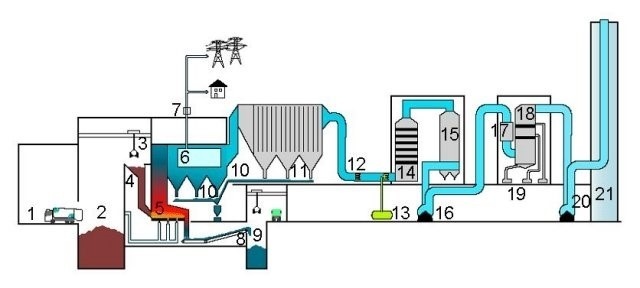 Rauchgasreinigung - Die Rauchgasreinigungsanlage scheidet alle gas- und staubförmigen Schadstoffe wirkungsvoll aus (entspricht der Schweizer Luftreinhalte-VO und den nach Deutschem Recht geltenden Immissionsschutzrechtlichen Bestimmungen): Die festen Partikel sondern sich im Elektrofilter ab (11), die Stickoxide wandeln sich nach Zuführen von Ammoniak (13) in Stickstoff und Wasserdampf um. Mehrstufige Nasswäscher (18) entziehen die gasförmigen Schadstoffe wie Salzsäure und Schwefeldioxid und scheiden Schwermetalle ab, die mit dem Waschwasser ausgeschleust werden. Ganz zum Schluss entweichen die gereinigten Rauchgase als Wasserdampf durch Kamine (21) in die Atmosphäre.